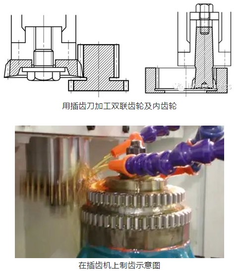 插齒通常被用來(lái)加工帶有臺(tái)肩的齒輪以及空刀槽很窄的雙聯(lián)或多聯(lián)齒輪, 人字齒輪,內(nèi)齒輪等,而這些類(lèi)型的齒輪通常采用滾齒很難實(shí)現(xiàn)。