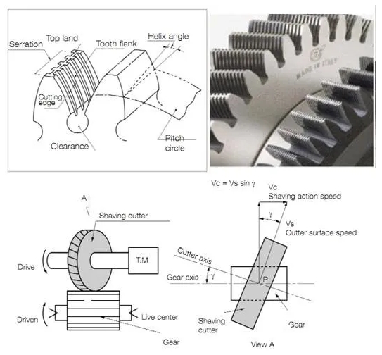 剃齒加工是根據(jù)一對(duì)螺旋角不等的螺旋齒輪嚙合的原理,利用剃齒刀與齒輪工件的嚙合傳動(dòng),從齒輪工件的齒面切削去微小的加工余量,進(jìn)行剃削。剃齒刀與被切齒輪的軸線(xiàn)空間交叉一個(gè)角度,它們的嚙合為無(wú)側(cè)隙雙面嚙合的自由展成運(yùn)動(dòng)。剃齒加工屬于齒輪的精加工,但只能用于非淬硬的齒輪(硬度小于35HRC),通過(guò)剃齒加工通常能提高齒輪精度一個(gè)等級(jí)。