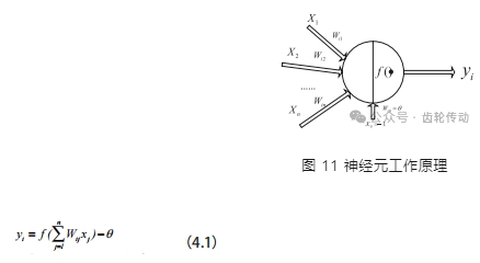 圖 11 表示了神經元的工作原理。其中 X1 ~ Xn 是從神經元 j 輸入到神經元 i 的信號,Wi1 ~ Win 表示對應的連接權值,yi 表示神經元i的輸出。