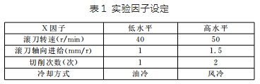 依據(jù)滾刀廠家推薦參數(shù)及實(shí)際加工過程中使用經(jīng)驗(yàn),設(shè)置4個(gè)因子 X的高、低水平,如表1所示。