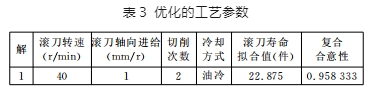 通過去除不顯著因子,修正回歸方程,對(duì)響應(yīng)參數(shù)優(yōu)化設(shè)計(jì)后,擬合出最佳的工藝參數(shù)如表3所示。通過對(duì)該參數(shù)分析,在主要因子滾刀軸向進(jìn)給取低水平、滾刀轉(zhuǎn)速取低水平時(shí)擬合的滾刀壽命取值最大,并且復(fù)合合意性比較接近1,總體看來此設(shè)置能夠?yàn)樗?響應(yīng)獲得一個(gè)較好的結(jié)果。