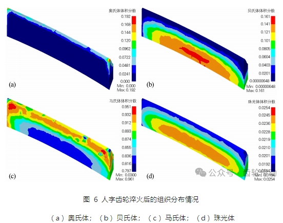 將齒輪模型及 CSS?42L 鋼的熱物性參數導入到 Deform 軟件中進行熱處理仿真分析。圖 5 為人字齒輪切分半齒剖面的碳含量云圖及人字齒輪不同部位碳含量梯度曲線圖,經過完整的滲碳工藝后,齒輪齒頂、齒根及齒面中心點表面的碳含量差異較小,碳含量分布較為穩定。其中:①人字齒輪齒頂部位表面碳含量最高,達到了約 0.9% ,高于齒面中心及齒根表面位置的碳含量,這是由于尖角效應的影響,在加熱過程中,該部位升溫較快,其表面的碳原子最先進入活性狀態,因此導致最終碳含量較高;②人字齒輪齒根位置的碳含量最低,達到了約0.8% ,由于該位置處幾何形狀呈向內凹陷的結構,升溫較慢,且此位置靠近齒輪心部,其表面的碳原子進入活性狀態所需要的時間較長,碳原子擴散速率較低,因此在人字齒輪齒根處的碳含量最低;③由于從人字齒輪齒面到齒輪底面的幾何形狀變化相對較小,此兩處部位的碳原子濃度相近,齒面上的碳含量代表了齒輪大部分區域,達到了約 0.85% 。