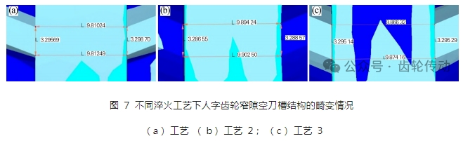 圖 7 為不同淬火工藝下人字齒輪窄隙結構處畸變情況仿真結果,可知,人字齒輪窄隙結構處發生了平面度變化,且兩側齒頂位置由于輪齒的畸變而導致窄隙寬度變窄。