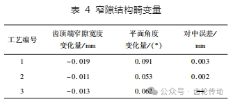 表 4 為 3 種淬火工藝窄隙變化量結果,由表 4 可知,工藝 1、2、3 齒頂端窄隙寬度變化量分別約為 -0.019、-0.011及-0.013 mm,平面度變化分別約為 0.091°、0.053°及 0.062°,而人字齒輪經 3 種淬火工藝后均沒有產生較大對中誤差。3 種工藝中,經工藝 2 處理后,人字齒輪齒頂端窄隙寬度變化量最小,且平面度變化不大,對比工藝 1 及工藝 3 的熱處理仿真結果而言,工藝 2 能更好地控制人字齒輪熱處理畸變量。