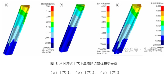 圖 8 是人字齒輪經 3 種淬火工藝處理后單側斜齒整體畸變量分布云圖,可知,人字齒輪單側斜齒最大畸變量出現在齒輪端面處,而在靠近人字齒輪窄隙端,輪齒幾乎沒有發生畸變,3 種工藝處理后,其最大畸變量分別為 0.341、0.310 及 0.333 mm,相比較而言,工藝 2能更好地控制人字齒輪熱處理后的畸變。