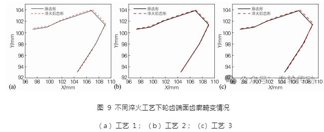 圖 9 為人字齒輪經 3 種淬火工藝處理后,輪齒端面齒廓畸變情況,可知,人字齒輪端面處的輪齒齒廓均有不同程度的膨脹,這是由于在端面處輪齒表面含有更多的晶粒粗大的殘留奧氏體,導致輪齒體積有少量的增大,且最大畸變量出現在齒頂位置,通過測量,輪齒經過工藝 1、工藝 2、工藝 3 淬火后,其齒廓最大畸變量分別約為 0.36、0.26 及 0.33 mm。