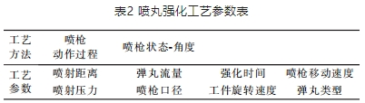 噴丸強化工藝參數包括噴射距離、彈丸流量、強化時間、噴槍移動速度、噴射壓力、噴槍口徑、工件旋轉速度、彈丸類型、覆蓋率等,其中任何一個參數的變化都會不同程度影響噴丸強度,即影響強化效果,如表2所示。