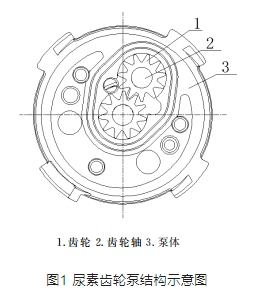 尿素齒輪泵為外嚙合齒輪泵,他是依靠主動齒輪帶動從動齒輪的旋轉(zhuǎn)使入口與出口的容積變化實現(xiàn)尿素水溶液的吸入與排出的液壓泵,如圖1所示;