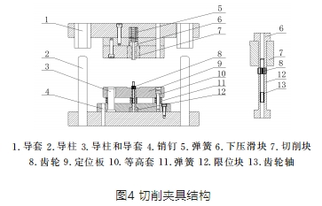 最后夾具分開,由彈簧推動下壓滑塊將加工好的齒輪從切削塊中頂出進行卸料,定位板則在底部彈簧的作用下復(fù)位。