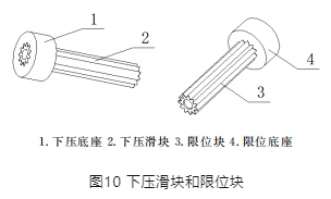 下壓滑塊和定位塊如圖10所示,主要作定位用途是通過定位工件來配合切削塊切削,因承受擠壓和沖擊,故要有一定的硬度和耐磨性,可選用 Cr12MoV 制造,淬火硬度 HRC58-62;下滑塊和限位塊用淬火后的 Cr12MoV 進行慢走絲加工,加工成齒輪條狀,與底座過盈配合,然后焊接牢固后磨平焊點。切削時,齒輪軸兩端分別穿入限位塊和下壓滑塊的內(nèi)孔,齒輪軸的尺寸為 Φ4.5,為了保證齒輪相對于齒輪軸的同心度, 內(nèi)孔尺寸比齒輪軸單邊大 0.05mm;為了便于安放齒輪和齒輪軸穿入下壓滑塊,限位塊和下滑塊的內(nèi)孔端口處做斜倒角0.1mm× 0.5mm。