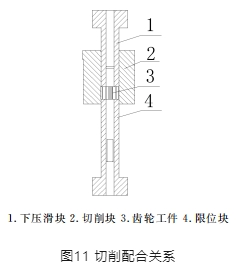 如圖12所示,切削過程中,切削塊在下壓滑塊上進行滑動,切削完成后,下壓滑塊將切削塊齒輪孔內(nèi)的工件進行頂出脫料,為了保證切削塊和下壓滑塊之間滑動平順, 兩者之間間隙約為單邊0.1mm;同理,如圖9所示,為了保證限位塊和定位板之間滑動平順,兩者之間間隙同樣為單邊0.1mm。