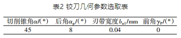 刀具角度的選擇直接影響加工精度及加工的穩定性。根據鉸刀的參數選取經驗與新式鉸刀選型表,確定鉸刀的幾何參數,如表2所示。