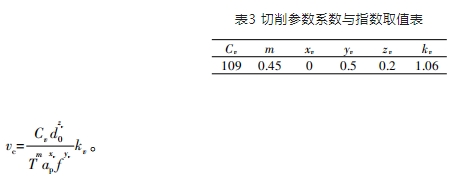 在其他參數不變的情況下,分若干組進行縱向對比試驗,每組試驗進給量在原有參數的基礎上降低0.01 mm并核算刀具壽命。目前廠家推薦進給量為每齒0.15 mm,根據切削參數,查找《機械加工工藝師手冊》,通過切削速度公式可以反求出相應的刀具壽命,表3為相關系數與指數的取值。