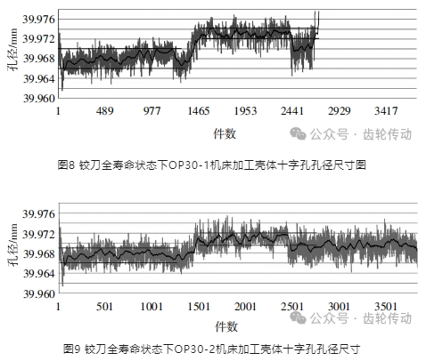 更換試驗用刀前,要分別對兩臺機床半精鏜后的孔徑進行確認,并在更換39.974 mm鉸刀后檢驗跳動值,兩臺機床均控制在2 μm以內。試驗設置對照組,選擇殼體壁厚較大的227型和232型產品進行試驗,由于232型產品壁厚最大,先對其進行測試,使孔徑公差下限得以驗證;待加工500件左右更換227型產品。OP30-1機床保留原有進給量(每齒0.15 mm),OP30-2機床進給量改為每齒0.12 mm。切削液濃度值在OP30-1機床保留當前使用范圍(7%~8%),OP30-2機床提高推薦濃度最大值為10%。調試完成后,正常進行每日的加工任務,跟蹤連續生產。