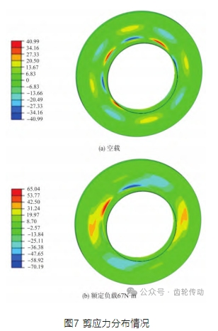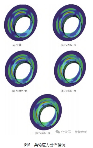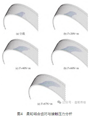 (1)當負載從 20N·m 增至 67N·m 時,柔輪與剛輪的最大接觸壓力只增加了約14%,嚙合齒對數增加了約68%,表明柔輪可以在負載變化下通過有效的周向的彈性變形實現載荷在齒對間的重新分配,負載的變化并不會顯著引起嚙合齒對的接觸壓力的變化。