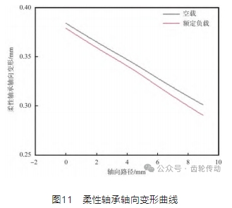 分析了外端面周向的徑向變形后,進一步分析軸承外圈長軸位置處沿著軸線方向的徑向變形量,如圖11所示,其中橫坐標表示分析位置到軸承外端面的距離,與圖10對應處的受載荷軸承長軸位置的徑向變形沿著軸線都變小,且在內端面位置達到最小徑向變形。