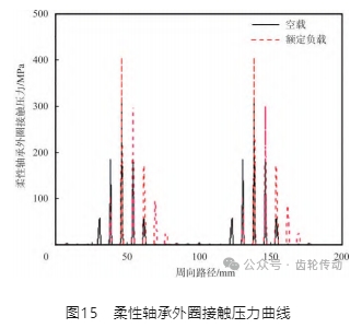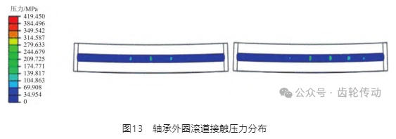 柔性軸承的復雜徑向變形除影響柔輪齒廓設計外,軸承內部的接觸壓力分布也會對軸承的壽命產生重要影響。圖 13 為軸承外圈在空載和負載情況下的應力分布云圖。從圖13中可知,在空載狀態下軸承外圈長軸端接觸滾子總數為5個,且滾子在長軸兩側對稱分布,滾子與滾道沿著長軸方向呈細長橢圓形接觸;空載下外圈滾道上最大接觸壓力為 318.3MPa,而加載后外圈滾道最大壓力上升到了 419.45MPa,滾道上的接觸壓力分布規律顯著發生變形,其壓力分布不再對稱,而是向長軸的一側偏移。