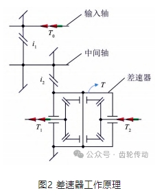 電驅動總成用減速器一般采用平行軸布置方式,電動機提供驅動力矩,并經輸入軸和中間軸傳遞至差速器殼體,再由一字軸傳遞至行星齒輪,最后通過半軸齒輪傳遞至兩個半軸,驅使車輪轉動,本文分析的差速器工作原理如圖2 所示,差速器殼體所受扭矩 T 通過式(1)計算得到。