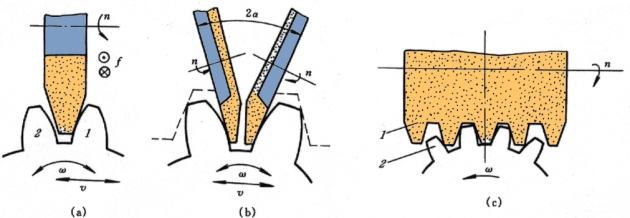上圖依次為a.錐形砂輪磨齒,b.蝶形砂輪磨齒,c.蝸桿砂輪磨齒。
