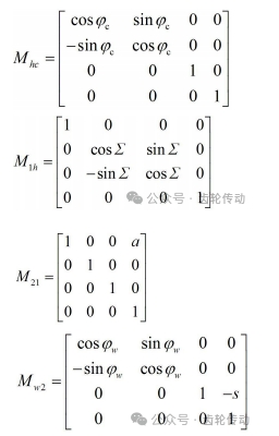 式中:Mhc、M1h、M21、Mw2 分別表示從車齒刀坐標系到車齒刀安裝坐標系、車齒刀安裝坐標系到車齒刀參考坐標系、車齒刀參考坐標系到工件參考坐標系、工件參考坐標系到工件坐標系的變換矩陣,其完整形式如下: