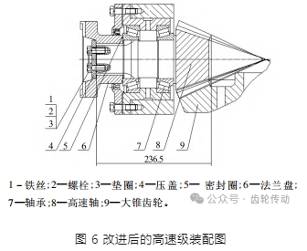 (3) 在組裝完軸承座、軸承等件后,高速軸與大錐齒輪配合齒面接觸率、錐齒輪的側(cè)隙調(diào)整至最佳狀態(tài)( 錐齒輪側(cè)隙為 0.1 ~ 0.3 mm,錐齒齒面接觸率齒長、齒高均大于 65% ) 后,現(xiàn)配調(diào)整墊,再組裝各件,現(xiàn)場確定壓蓋(詳見圖 4) a 尺寸再加工,然后組裝壓蓋,2 個螺栓擰緊后,2 個螺栓頭部穿鐵絲擰緊,2 個螺栓連接成 8 字防松狀態(tài); 法蘭盤端面上開 1 個圓槽,圓槽內(nèi)裝密封圈,解決了減速箱的滲油問題。最后在軸承座端面上涂抹密封膠,壓上軸承蓋,6 個螺栓和墊圈將軸承蓋與上箱體緊固。這樣萬向聯(lián)軸節(jié)就不會與螺栓干涉,再加上 2 個螺栓頭部穿鐵絲擰緊,可以有效利用鐵絲的拉力使螺栓保證一定的拉緊力,不會產(chǎn)生旋動,更不會使高速軸裝配尺寸在高速運(yùn)轉(zhuǎn)時(shí)發(fā)生變化。改進(jìn)后的高速級裝配圖如圖 6 所示。