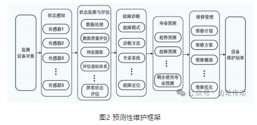 預測性維護的框架結構如圖 2 所示,包括狀態感知、狀態監測與評估、故障診斷、壽命預測、維修管理。