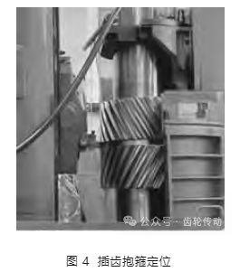 精加工設(shè)備及工藝:粗開齒后,齒部留量較少,需根據(jù)零件實際加工狀況和插齒機加工范圍,選擇相應(yīng)的設(shè)備和制作專用的工裝。在精加工過程中,需保證齒部精度達到 GB-7 級,對零件的裝夾定位要求較高,需考慮定位位置軸外圓精度、工裝定位套和軸外圓配合間隙,抱箍定位間隙一般要求 0.1mm 左右,結(jié)合機床自身附件抱架,使軸處于立式裝夾定位狀態(tài),如圖4 所示。