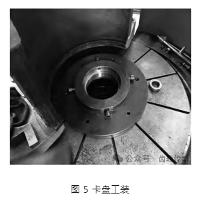 專用工裝中間可為空心,也可帶卡爪,既能將零件下端續(xù)進機床工作臺下邊,又能保證卡爪裝夾,再通過軸向定位,保證中間人字齒位于機床主軸銑齒區(qū)間范圍內(nèi),上端用抱箍抱住軸外圓,實現(xiàn)定位,下端卡盤使軸和工作臺一起轉(zhuǎn)動,保證 80%以上零件的裝夾要求,如圖 3 所示。