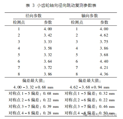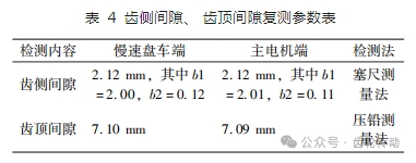 從表 2 中數(shù)字看,齒頂間隙超出廠家標(biāo)準(zhǔn)值(齒頂間隙 5. 5mm,齒側(cè)間隙 1. 88 mm)。由于大小齒輪形為斜齒,檢查齒輪嚙合情況時(shí)是以齒側(cè)間隙參數(shù)為準(zhǔn)則,齒頂間隙參數(shù)只做參考。