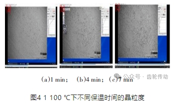 加熱溫度960 ℃下晶粒度變化:為進一步研究滲碳溫度對晶粒度的影響,將模擬滲碳的溫度調至960 ℃,同樣的加熱方式分別截取保溫 1 min,4 min 和 7 min 時試樣的實時晶粒度照片如圖6。