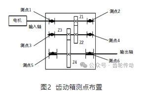 共選取了6個測點,布置6個加速度傳感器。選取測點原則是要安裝在對振動最敏感的位置,確保能夠拾取更多包含有故障信息的振動信號,同時又要能夠得到更多位置、方向的振動信息。根據(jù)齒輪箱外形的特點,把測點布置在箱體的平面上和軸承座的受力方向上,具體如下: