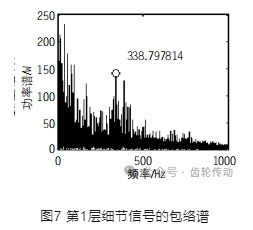 為了提取外圈故障頻率,進(jìn)一步對第1層細(xì)節(jié)信號d1做Hilbert包絡(luò)并進(jìn)行譜分析。從功率譜的分析中可以發(fā)現(xiàn)頻率338.8Hz的存在,如圖7所示,而軸承故障特征頻率為外圈通過頻率f0及其倍頻,理論計算得到f0=338.1Hz,通過對照可知,軸承的處圈發(fā)生了點蝕故障。