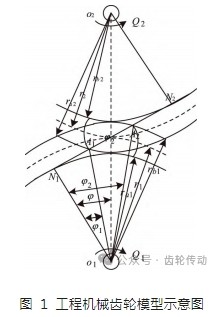 如圖 1 所示,o1 與 o2 表示的是主動齒輪與從動齒輪的中心;Q1 與 Q2 表示的是主動齒輪與從動齒輪的運動方向;N1 與 N2 連線表示的是齒輪副理論嚙合線;A1 與 A2 連線表示的是齒輪副實際嚙合線;r1 、ra1與 rb1分別表示的是主動齒輪對應的分度圓半徑、齒頂圓半徑與基圓半徑;r2 、ra2與 rb2分別表示的是從動齒輪對應的分度圓半徑、齒頂圓半徑與基圓半徑;φ 表示的是齒輪的壓力角;φ1 與 φ2 表示的是主動齒輪與從動齒輪對應的壓力角。齒輪基圓,分度圓和齒頂圓對應的半徑數值如下式所示: