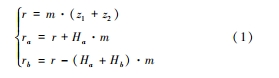 式(1)中,r、ra 與 rb 表示的是齒輪基圓、分度圓與齒頂圓的半徑;m 表示的是齒輪模數;z1 與 z2 表示的是主動齒輪與從動齒輪對應的齒數;Ha 表示的是齒頂高系數;Hb 表示的是頂隙系數。