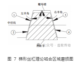梯形絲杠副的嚙合區域大小影響其傳動的平穩性、自鎖性、絲杠副的磨損和牙面接觸壓力,因此應盡可能增大接觸面積,保證足夠的嚙合區域。當梯形絲杠和配作螺母的牙型半角與標準值相比存在偏差,絲杠副傳動時配作螺母在梯形絲杠的牙面嚙合區域以中徑線為邊界,分為 4 部分(①、②、③、④)。
