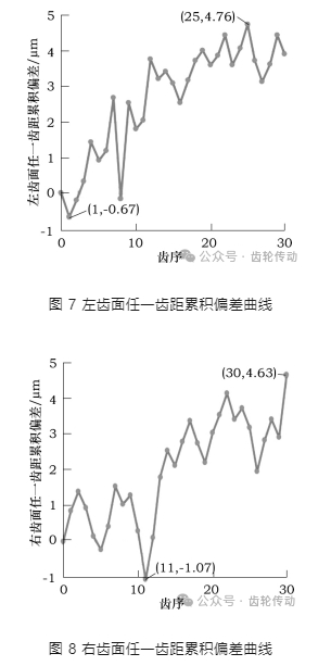 經測量計算可得該被測齒輪左、右齒面任一齒距累積偏差,將其繪成曲線,分別如圖 7 和圖 8 所示。