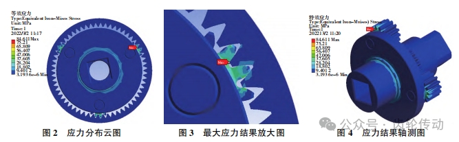 應(yīng)力分布云圖、最大應(yīng)力結(jié)果放大圖和應(yīng)力結(jié)果軸測圖分別如圖 2、圖 3 和圖 4 所示。從圖 2 可以看出行星齒輪輪齒和輸出軸根部應(yīng)力較大并且最大應(yīng)力在行星齒輪根部,為84.611 MPa,小于行星輪許用齒根彎曲應(yīng)力值 529 MPa,故行星輪齒根彎曲強度校核通過。從圖 4可以發(fā)現(xiàn)行星齒輪輪齒應(yīng)力沿齒向分布不均勻程度較大,這主要是由于行星架結(jié)構(gòu)采用的是單側(cè)板式行星架結(jié)構(gòu)。所以如果所設(shè)計微型行星齒輪減速器空間條件允許的情況下,可以考慮使用雙側(cè)板整體式行星架。