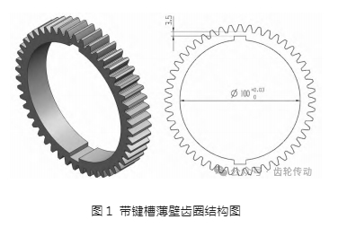 此類薄壁齒圈內孔有兩對稱鍵槽,輪齒部位作為傳動、內孔鍵槽作為固定連接零件,其高轉數和高載荷的使用工況,對其制造工藝提出了較苛刻的要求,由于尺寸和技術條件的偏離,會導致整個機械系統不能正常工作,使可靠性穩定性降低,因此必須考慮提供一種精度高、熱處理穩定、不易變形、適用于批量生產的帶鍵槽薄壁齒圈的加工工藝,去保證零件的性能。