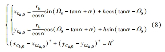 由圖 3 可知,Gk,0 為殘留高度點,是曲線 ε2 和刀位點 CLk,0處刀具圓弧交點,Gk,0點可通過式(8)求取。