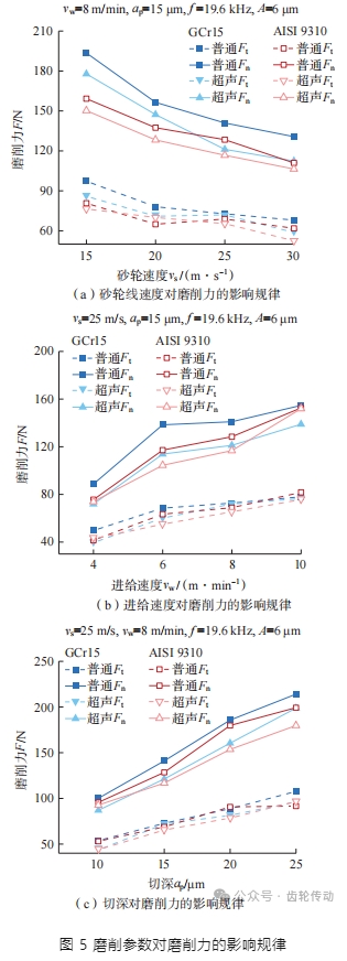 淬硬鋼平面磨削過程中,磨削參數對切向磨削力和法向磨削力的影響規律如圖 5 所示。超聲磨削降低磨削力效果顯著(圖 5(a)),隨著砂輪線速度從 15 m/s 增大至 30 m/s,普通磨削和超聲磨削的法向和切向磨削力均呈減小的趨勢,與普通磨削相比,超聲條件下,GCr15 與 AISI 9310 的切向磨削力最高降低 13.64% 與 15.04%,法向磨削力最高降低 14.08% 與 9.1%;如圖 5(b)所示,隨著進給速度從 4 m/min 增大至 10 m/min,普通磨削和超聲磨削的法向和切向磨削力均呈增大的趨勢,與普通磨削相比,超聲條件下,GCr15 與 AISI 9310 切向磨削力最高降低 20.51% 與 13.17%,法向磨削力最高降低18.91% 與 10.87%;如圖 5(c)所示,隨著磨削深度從 10 μm 增大至 25 μm,普通磨削和超聲磨削的法向和切向磨削力均呈增大的趨勢,與普通磨削相比,超聲條件下,GCr15 與 AISI 9310 切向磨削力最高降低 19.07% 與 17.36%,法向磨削力最高降低 14.08% 與 14.6%。張洪麗指出,切向超聲振動對單顆磨粒切削深度的影響甚微,但切向超聲振動的斷續磨削特性能夠提高砂輪磨粒的微破碎,使磨削過程中磨粒切削刃一直鋒利,實現了磨削力的降低。此外,GCr15 作為高碳鉻鋼,有較多的網狀和片狀滲碳體組織,且 Cr 元素含量高導致磨削溫度升高后伴有二次硬化的作用,因此其磨削力高于低碳鋼 AISI 9310。