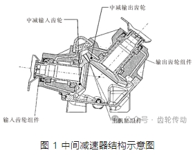 中間減速器是直升機傳動系統的重要部件,由輸入齒輪組件、主機匣組件、和輸出齒輪組件組成(如圖 1 所示),主要作用是根據直升機的需要,在為尾水平軸和尾斜軸之間傳遞功率并按要求進行減速和換向,具有設計結構緊湊、承載能力大、功重比高的特點。某直升機傳動系統中間減速器承載最大功率達 650kW,為減小尺寸和重量,并保證齒輪傳動平穩性和承載能力,采用了一級滿載嚙合的螺旋錐齒輪,輸入齒輪、輸出齒輪是一對軸交角為 122.308°的格里森齒制螺旋錐齒輪,齒輪齒頂圓角 R0.3~0.5,材料均為 9310 鋼,齒輪齒面、齒槽底面及規定表面滲碳,深度 1.30~1.50,滲碳表面硬度 HRA81~83,非滲碳區硬度 HRC33~41,磨齒后齒輪齒面、齒根及幅板面進行噴丸處理,噴丸強度為 0.007~0.009A(英寸),覆蓋率 200%。