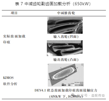 結合實際齒面的加載印痕和加工控制參數計算齒面接觸應力,通過 KIMoS 軟件仿真,中減齒輪副在最大功率 650kW 下齒面接觸應力為 1628MPa,中減齒輪副加載分析(見表 7 所示)。雖然齒面理論接觸應力仍小于許用值,但已十分接近,并且本型號中減齒面印痕為 “滿齒面設計”,考慮到制造、裝配誤差,實際中減大功率加載試車后中減輸出齒輪印痕超出齒面,中減輸出齒輪齒頂參與嚙合,形成邊緣接觸,應力集中加劇,容易引起擦傷。