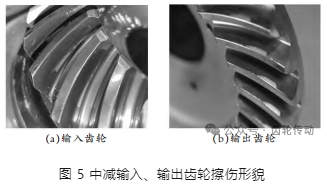 根據故障分析和故障定位,選用齒頂圓角(工作面)R0.342~0.478,齒頂與齒面轉接處未做到理論上的相切的中減輸出齒輪后再次進行磨合試車及大功率試車,完成后對中減進行分解檢查, 發現中減輸入齒輪和中減輸出齒輪仍有有輕微擦傷(見圖 5)。擦傷形貌為:輸入齒輪齒面上除了接觸印痕之外,在接觸印痕下方有一條亮帶;輸出齒輪凸面靠近齒頂位置磨亮,故障復現。