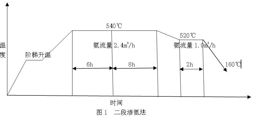 我廠采用負(fù)低壓真空滲氮處理,通過控制氨氣滴注量來調(diào)節(jié)氨氣的分解率。其中氨氣采用循環(huán)滴注,產(chǎn)品的裝夾方式為平放,先低溫入爐預(yù)氧化一段時(shí)間,隨后階梯升溫至滲氮溫度,具體工藝見圖1所示。