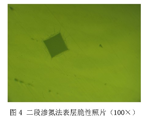 采取之前同樣的方式對(duì)產(chǎn)品進(jìn)行了理化檢驗(yàn),其中表面硬度為950-950HV,滲氮層深為0.27mm,化合物層0.008mm。圖6為該工藝下錐齒輪齒角部位的金相組織。由圖可見,相對(duì)于圖3,化合物層較致密,表層有少量細(xì)點(diǎn)狀空隙,齒輪疏松評(píng)定為2級(jí)。擴(kuò)散層中存在少量呈脈沖狀分布的氮化物,氮化物評(píng)定為2級(jí)。圖7為表面脆性照片,可見,在四方形的一邊出現(xiàn)了很少量的裂紋,故脆性評(píng)定為2級(jí)。由此可見,氮化后的技術(shù)指標(biāo)完全符合產(chǎn)品的技術(shù)要求。