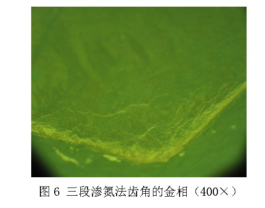 對(duì)產(chǎn)品進(jìn)行理化檢驗(yàn),其表面硬度為1110-1130HV。用制樣機(jī)將錐齒輪的齒角處制成金相試樣,采用4%的硝酸酒精溶液腐蝕,在金相顯微鏡下觀察組織,見圖3。進(jìn)過檢驗(yàn),產(chǎn)品氮化層深為0.37mm,化合物層深0.012mm。