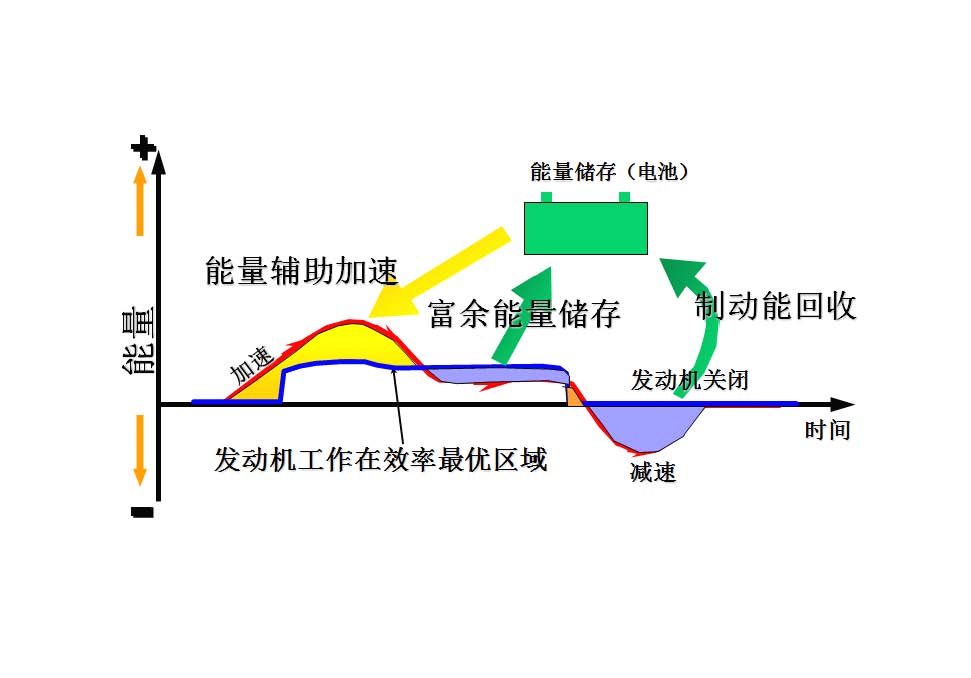 混合動力客車的原理即:充分利用發(fā)動機的經(jīng)濟區(qū)域,使整車更多的處于此區(qū)域工作,同時通過能量存儲裝置,適時釋放和回收能量,協(xié)助整車運行,達到節(jié)省燃油的目的。