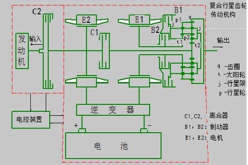 此傳動裝置結(jié)構(gòu)包括發(fā)動機、電動/發(fā)電機(E1)、電動/發(fā)電機(E2)、離合器C1、離合器C2、制動器B1、制動器B2、復(fù)合行星齒輪機構(gòu)(也稱拉維納式行星齒輪機構(gòu))、逆變器、電池和電控裝置。