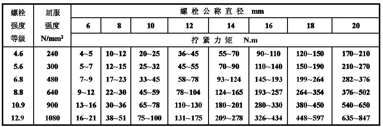4.所有緊固螺栓應按規定的力矩,用力矩扳手上緊,其標準詳見表4所示。
