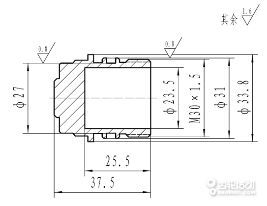 旋轉(zhuǎn)類(lèi)零件如某螺塞零件,最大外圓直徑為φ33.8,材料為T(mén)C4,原材料選用φ30棒材。零件采用一次車(chē)削加工完成(如圖1)。為了保證零件加工精度,加工設(shè)備選用了進(jìn)口數(shù)控車(chē)床,其主軸轉(zhuǎn)速最高6000轉(zhuǎn)/分,主軸跳動(dòng)小于2μm,加工時(shí)主軸震動(dòng)極小加工穩(wěn)定性好,冷卻液可由3個(gè)方向噴出,冷卻充分。